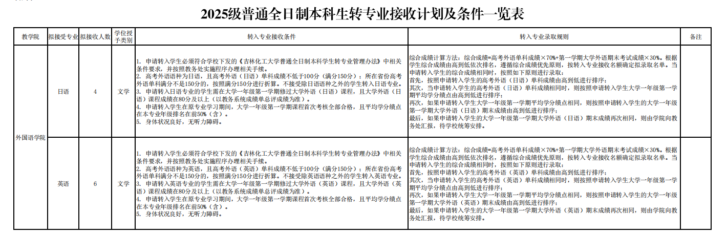 吉林化工大学2025级普通全日制本科生转专业接收计划及条件一览表(英语专业、日语专业)