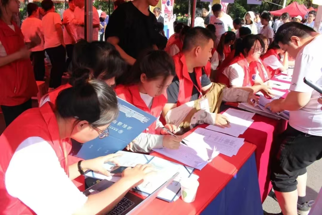 烈日当空之时,学生骨干助新生。红色身影舞新风,忙碌短时长如梭。引领新生迈向梦想,共同逐梦不辍情。青春短歌唤时光,情牵新生通往